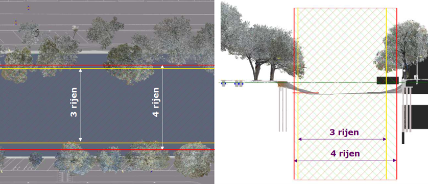 Figuur: Weergave uit BIM-model met verschil in bouwkuipbreedte voor 3 en 4 parkeerrijen en raakvlak met bomen.