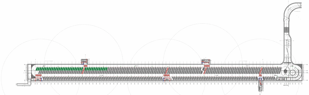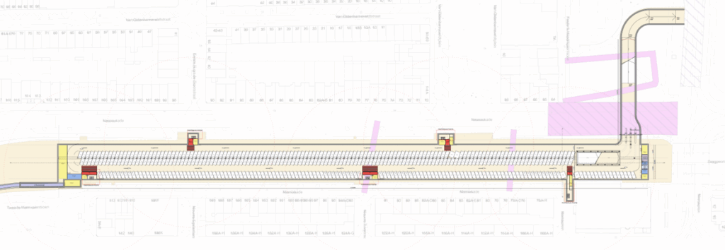 • In overleg met de parkeeradviseurs vanuit zowel Mobilis als de gemeente Amsterdam is gekozen voor een bredere rijbaan die direct langs de kelderwand loopt. Deze rijbaan is uiteindelijk 4,18 m geworden terwijl 4,08 m wordt voorgeschreven vanuit NEN2443 [2]. Dit komt ten goede aan de draaicirkels en het gebruiksgemak voor het inparkeren aan deze zijde; het voorkomt extra terugsteken en daarmee opstoppingen en onveilige situaties. Om extra bouwkosten/meerwerk te voorkomen zijn, in overleg met diezelfde parkeeradviseurs, de parkeervaklengtes in de dubbele parkeerrij iets verkort ter compensatie.